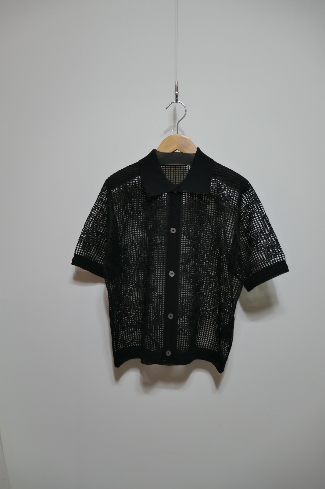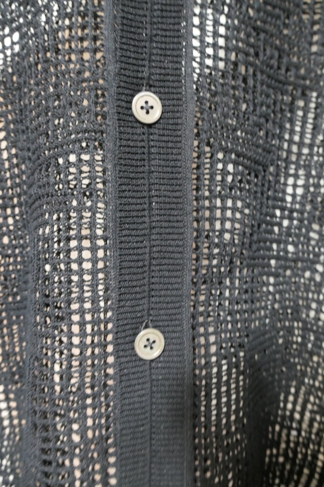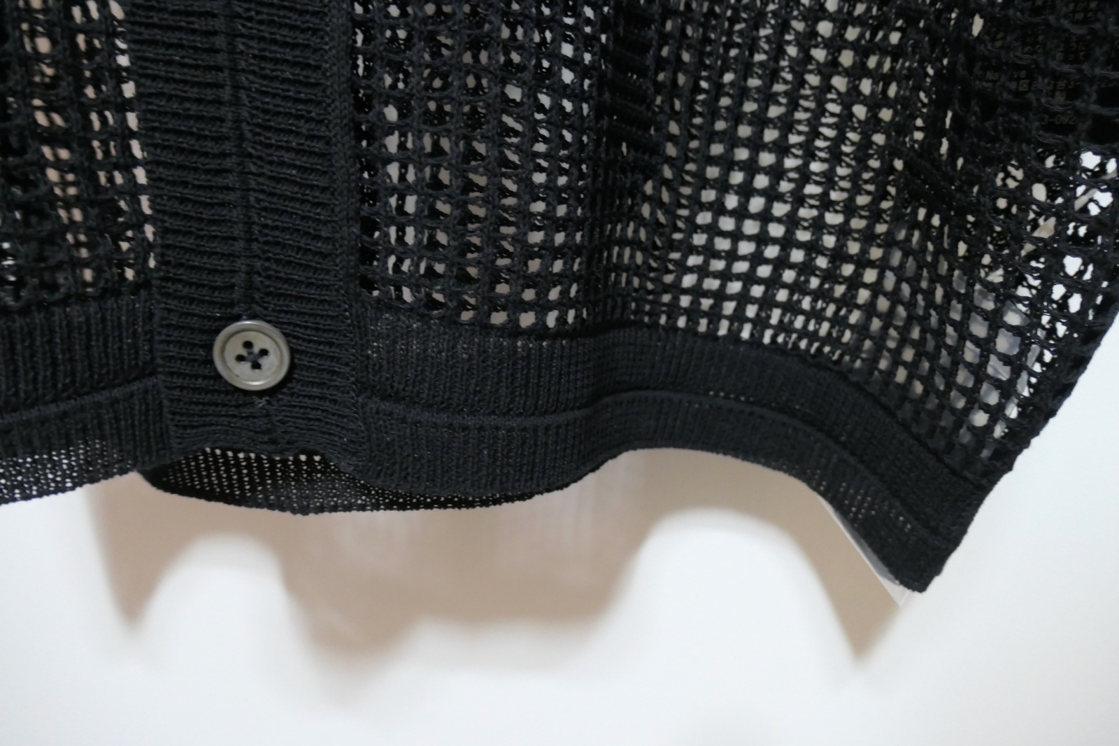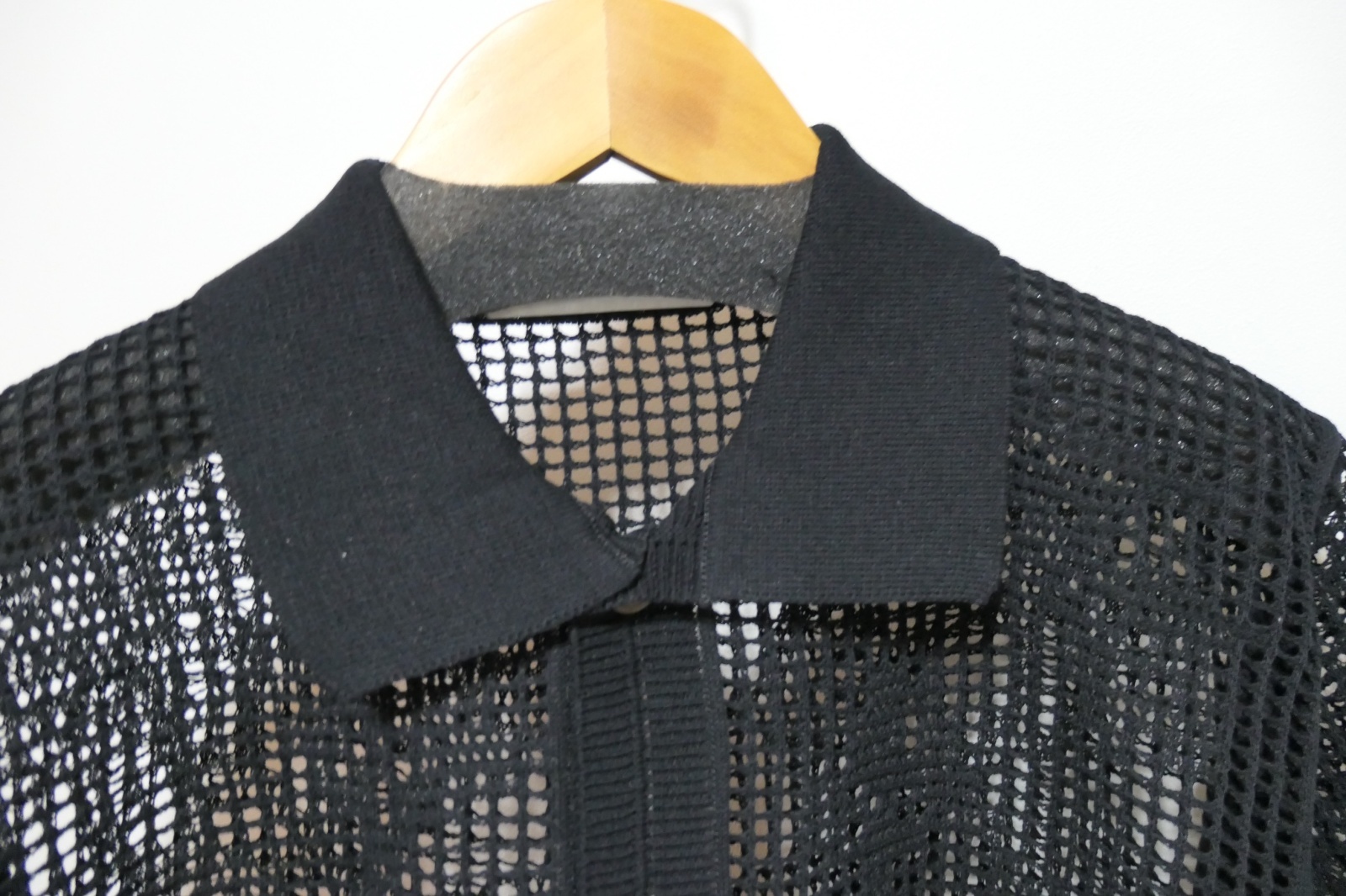メッシュに編み立てた半袖のポロ衿カーディガンです。