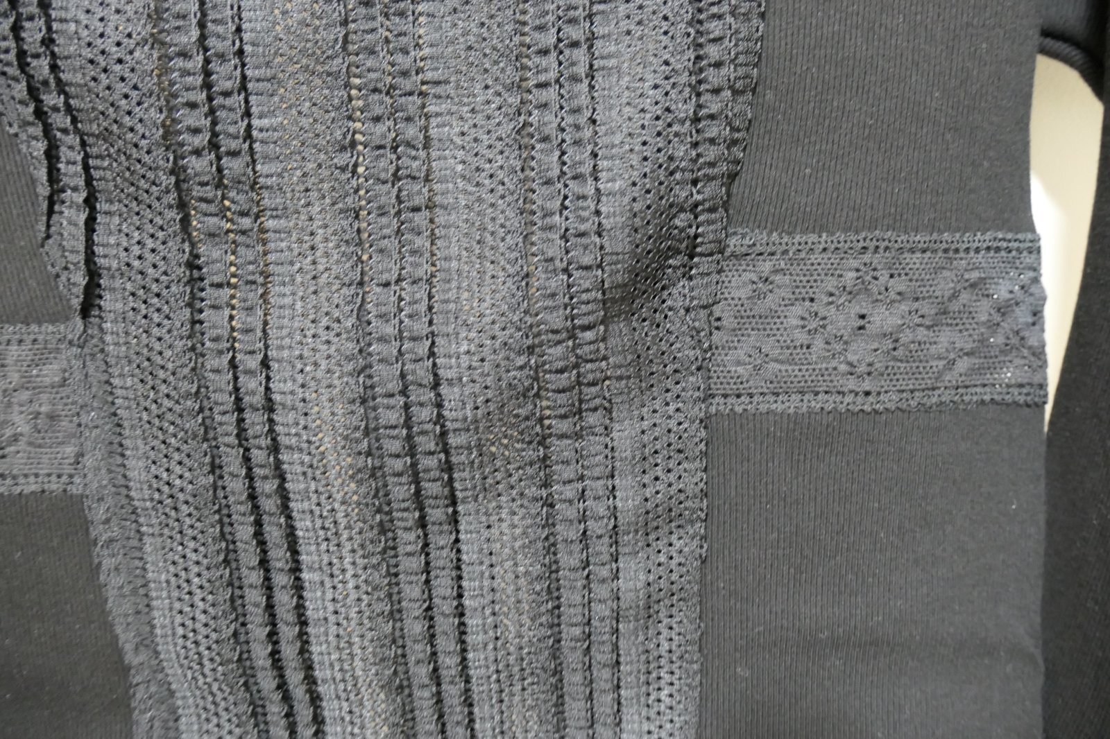 2種の伸縮性のあるストレッチレースとテープを配したカットソー。