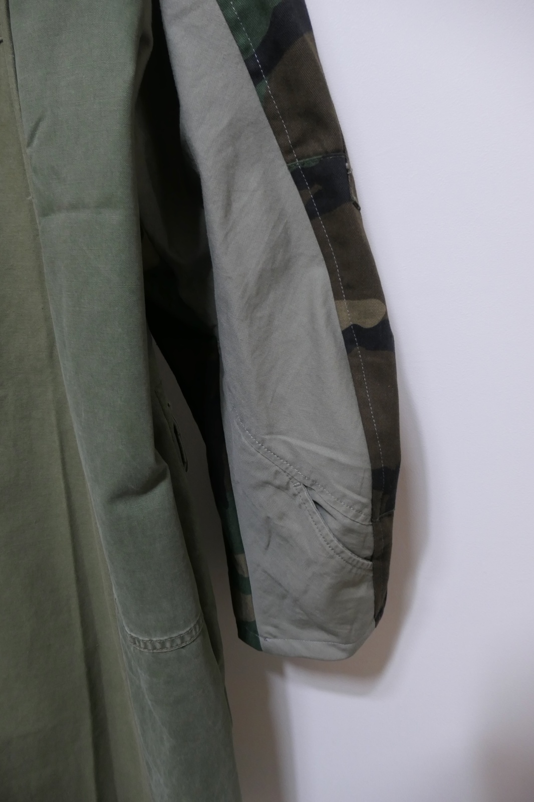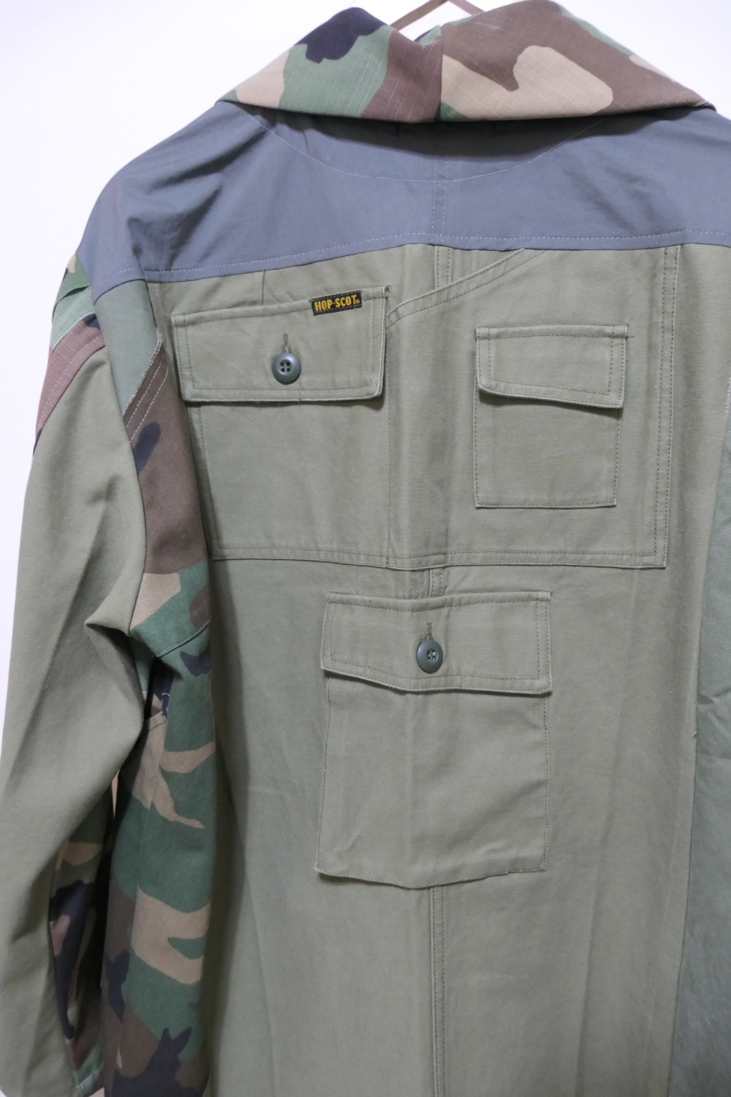 カモフラージュ柄や無地のミリタリーパンツを解体し再構築されたワークコートです。